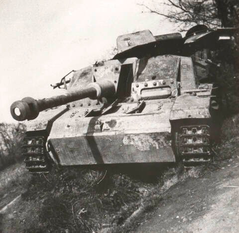 StuG III destroyed by AT fire, note the modified Shurzen and debris guard on top of the Mantlet. |